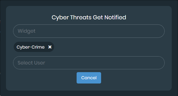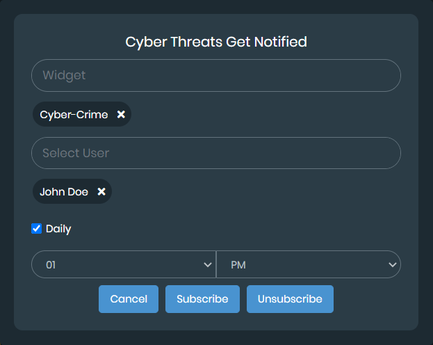 - Go to Adversary Centric Intelligence > OSINT - Cyber Threats, and click the Add Subscription button. The Cyber Threats Get Notified dialog is displayed.