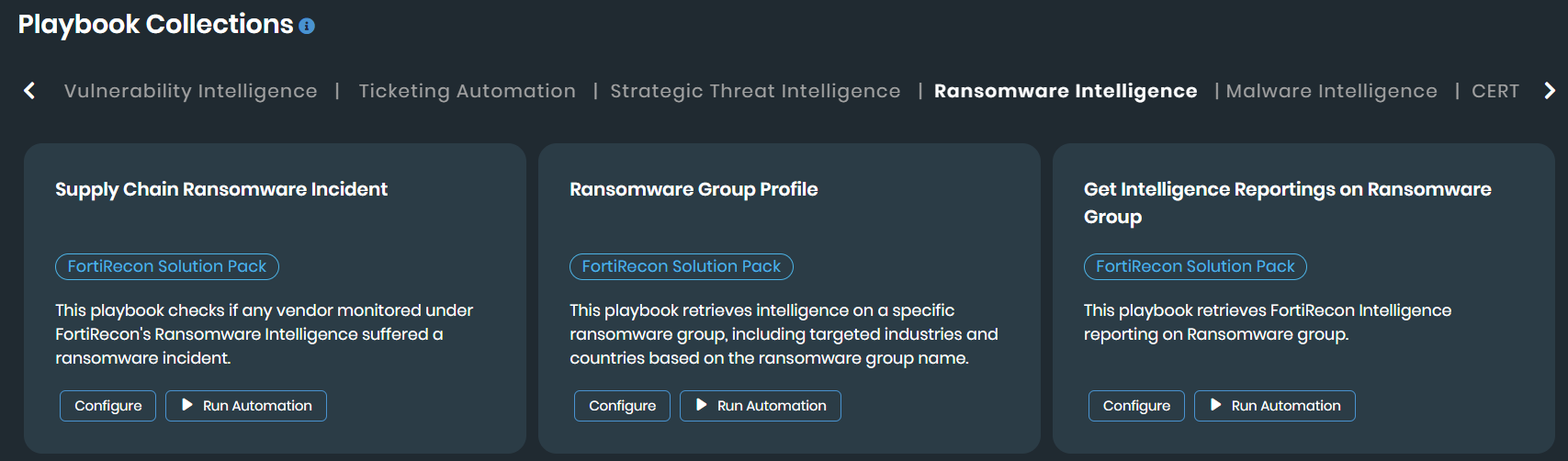 For example, select the Ransomware Group Profile playbook under the Ransomware Intelligence collection.
