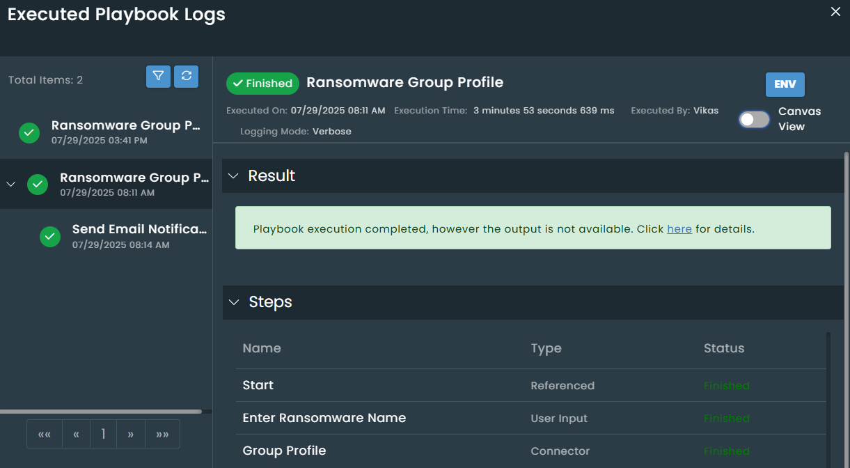 You can view the details of each step in the execution history, including environment data in the INPUT and OUTPUT sections. Toggle to the canvas view for a visual representation. See Execution Logs.