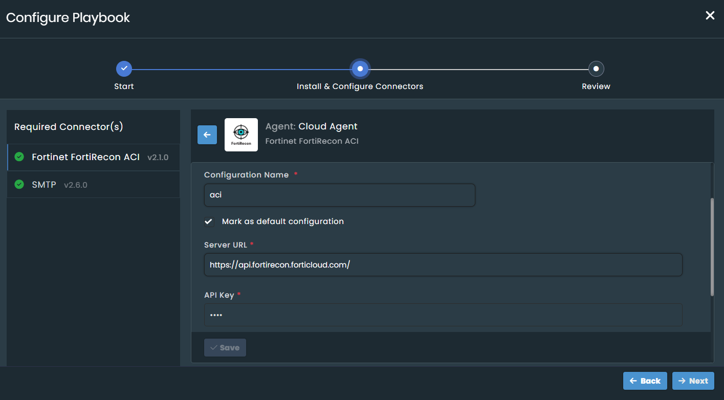 Configure the required connectors. For example, the Ransomware Group Profile playbook requires Fortinet FortiRecon ACI and SMTP connectors.