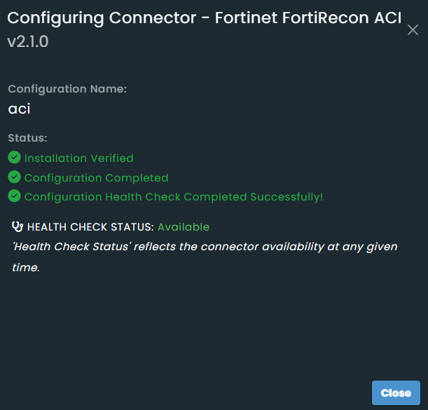 The Configuring Connector status dialog displays information about the configuration process. Ensure the Health Check Status is Available to confirm the connector is configured properly. If the status shows Disconnected, reconfigure the connector.