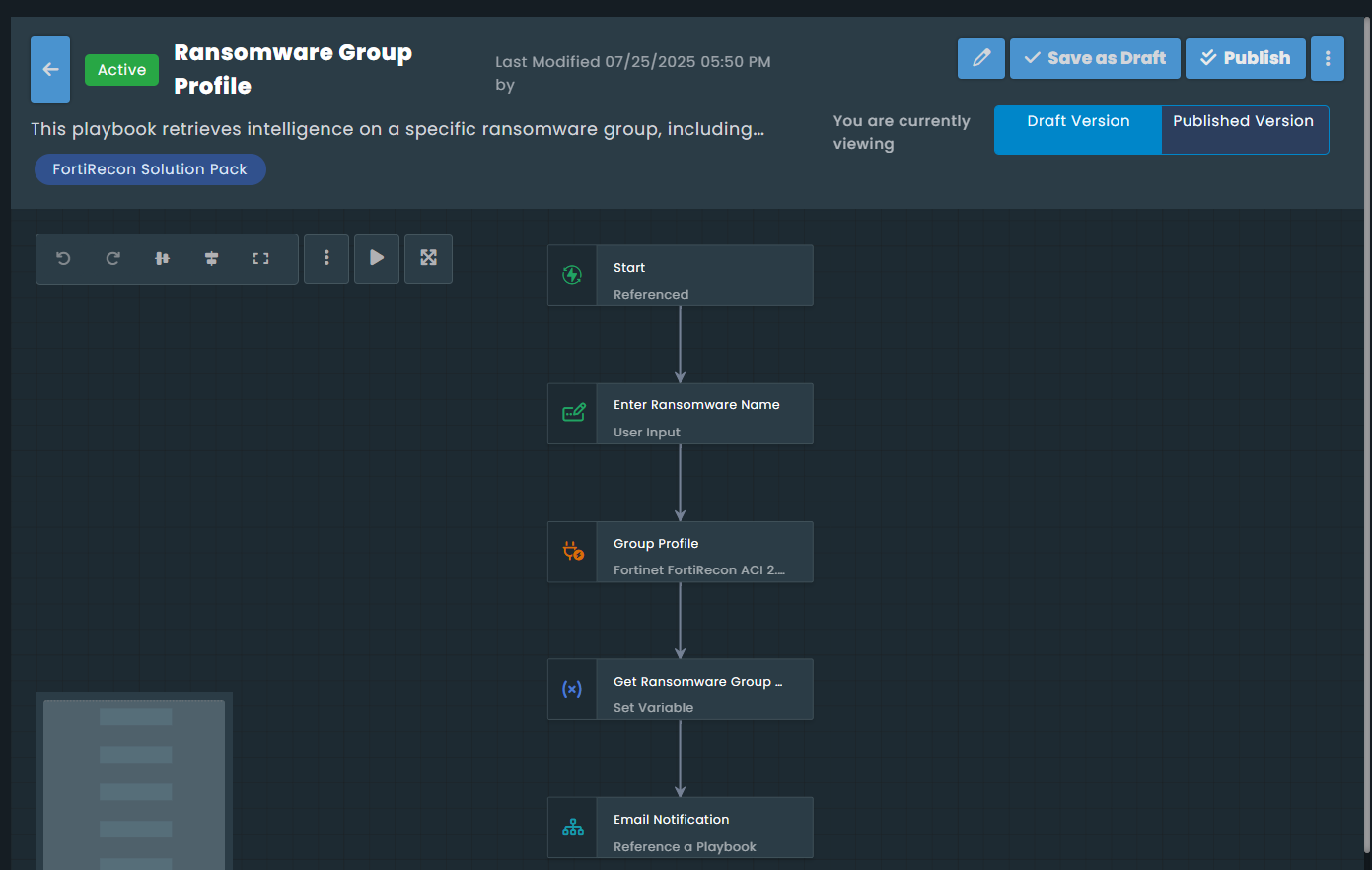 The playbook designer window opens, displaying the configured steps. For this example, the playbook begins by prompting you to enter a ransomware group name, then uses the Fortinet FortiRecon ACI connector to fetch relevant data. It then sets a variable with this data and proceeds to send an email notification.
