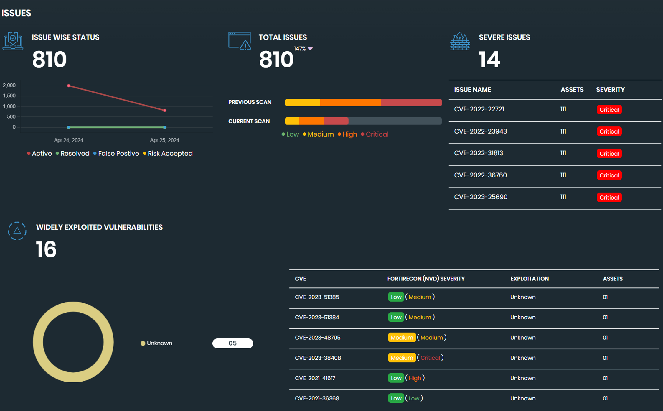 The Attack Surface Management > Dashboard page displays the following widgets that summarize potential security issues in the Issues section: