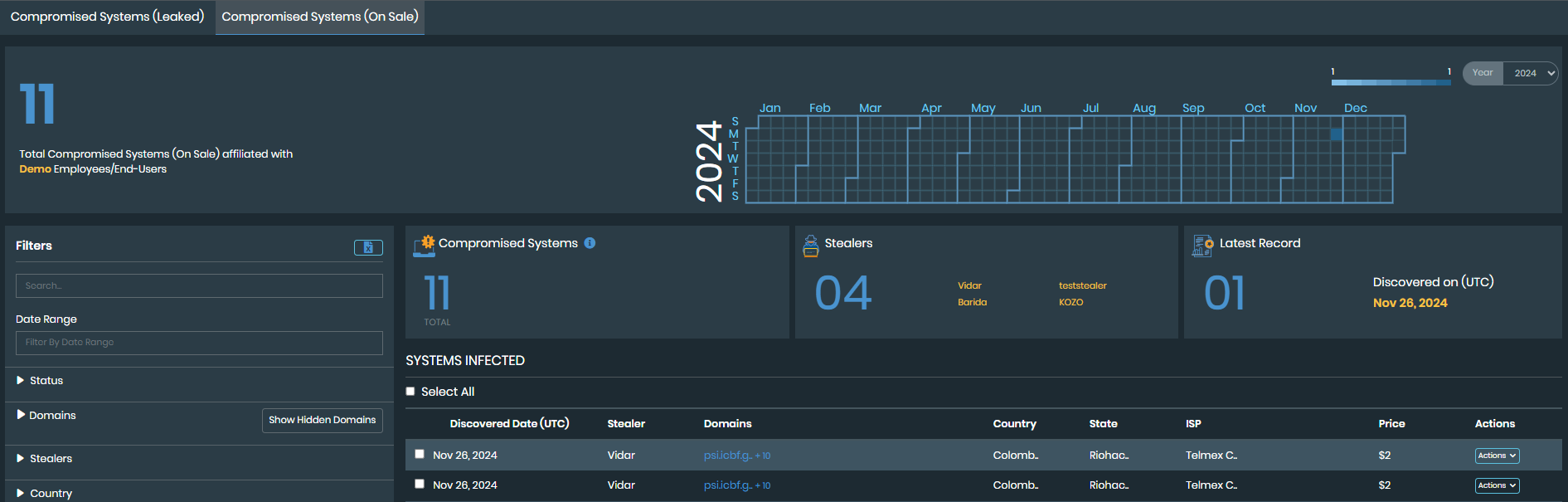 The Adversary Centric Intelligence > Stealer Infections > Compromised Systems(On Sale) page displays information about possible infected systems that are affiliated with your employees or end-users and are for sale on darknet market places.