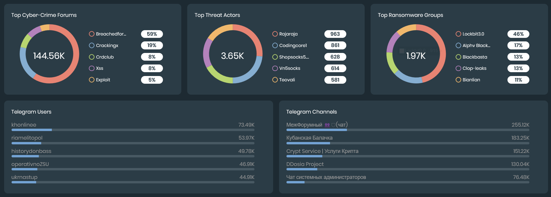 Top Threat Actors: Displays the top 5 threat actors contributing to Darknet posts.