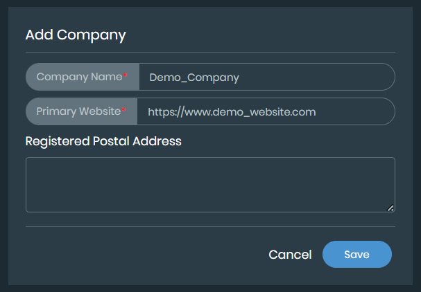 In the Company Details Overview page, click + Add Company to add a new company and enter the following details. .