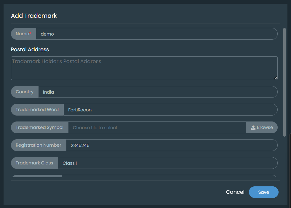 Click Save. The added trademark is listed. Click Edit under Actions to edit the trademark details or Delete to delete the added trademark.