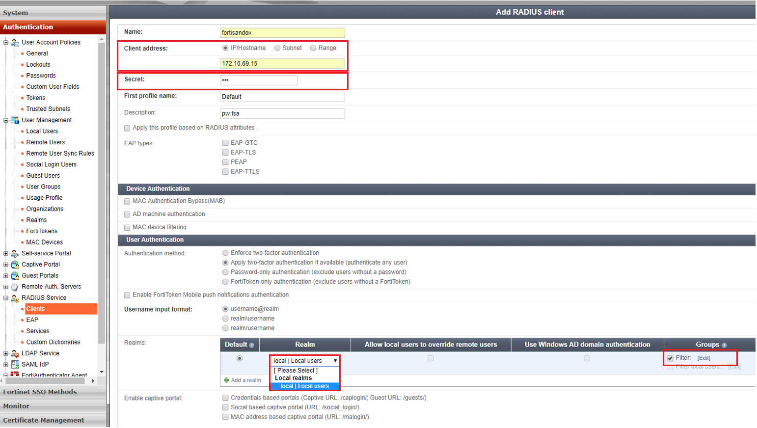 - On FortiSandbox, set up the RADIUS server in System > RADIUS Servers.