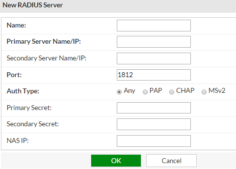 Enter the authentication type the RADIUS server requires. The default setting of ANY has the FortiSandbox try all the authentication types. Select one of: ANY, PAP, CHAP, or MSv2.