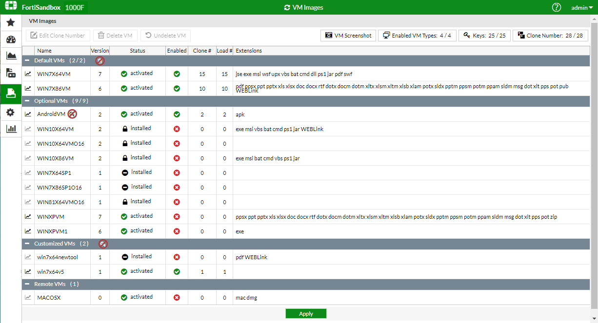 VM clone number. Double-click the number to edit it and then click the green checkmark to save the new number. Click Apply to apply the change. The VM system re-initializes. The total clone number of all VM images cannot exceed the number of installed Windows licenses. For example, for FSA-2000E, the maximum clone number is 24. We recommend applying more than 8+clone_number*3 of memory on your FSA unit. |