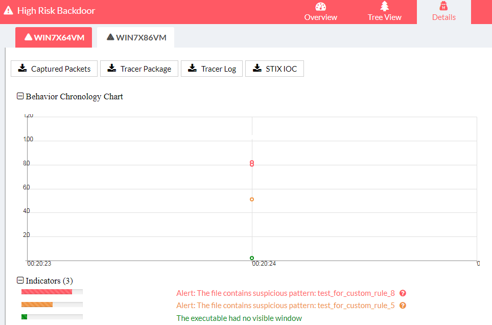 Regular YARA rule is applied in both the Static Scan stage and VM Engine scan stage. During the VM Engine scan stage, if any dump file hits the regular YARA rule, the Indicators section will show the User-defined YARA with the YARA rule name.