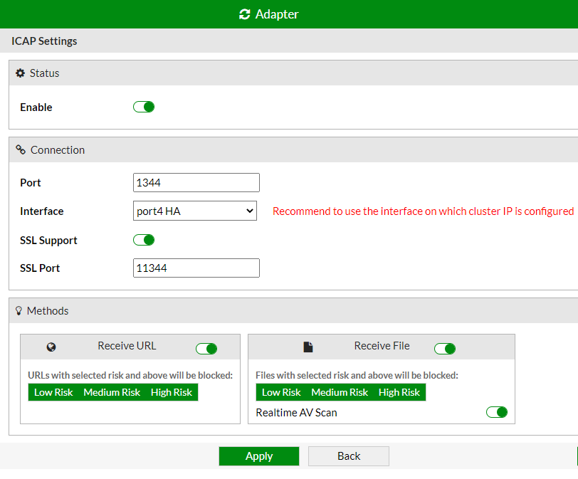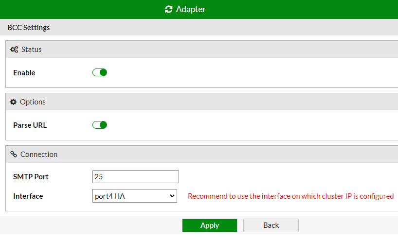 - If you enable adapters such as ICAP, BCC, or MTA on the primary port4’s failover IP, in adapter’s client configuration, you must specify primary port4’s failover IP to make adapter clients send traffic to FortiSandbox HA cluster. The following examples are for BCC and ICAP settings.