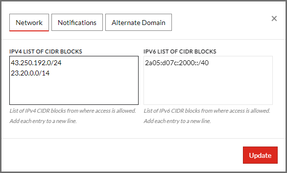 Select the field below IPV4 LIST OF CIDR BLOCKS or IPV6 LIST OF CIDR BLOCKS, depending on whether you wish to modify IPV4 or IPV6 respectively, and enter a new CIDR block on a new line, or edit an existing one.