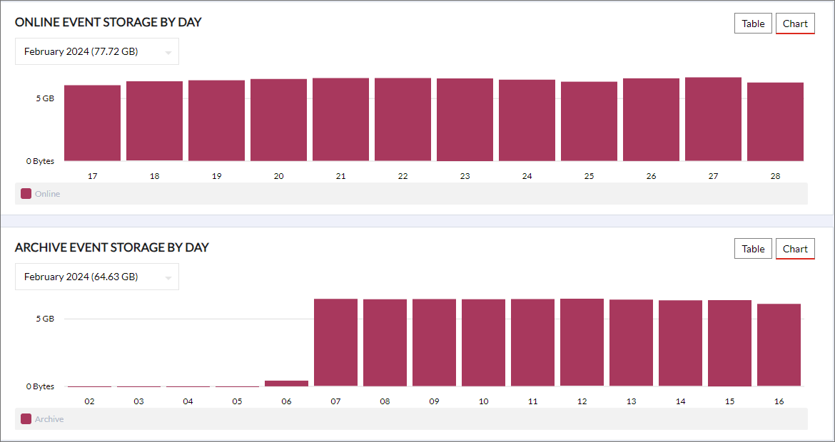 An example of daily usage event storage (Online Event Storage by Day and Archive Event Storage by Day) is shown here: