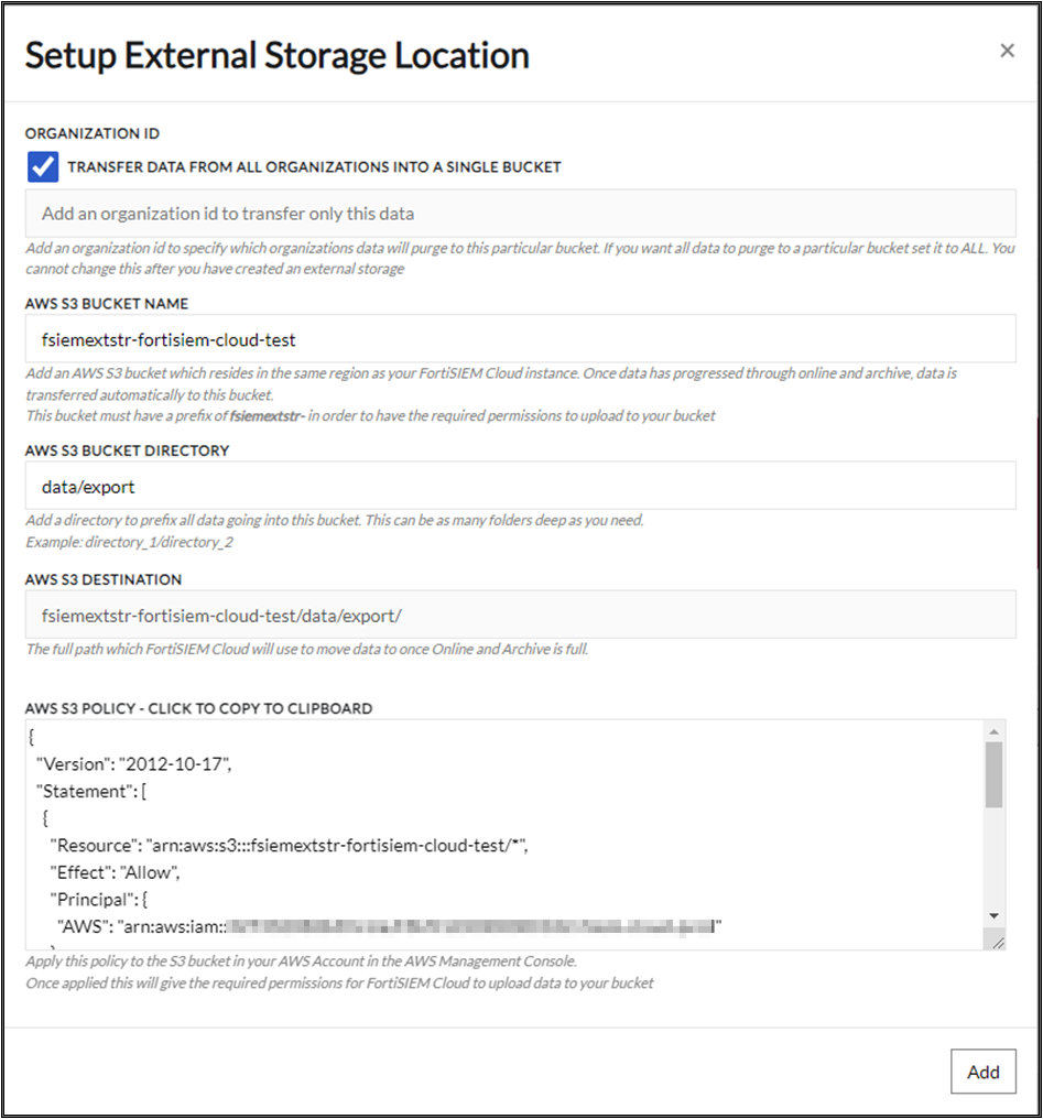 External storage provides you with the ability to seamlessly transfer data from your FortiSIEM Cloud instance to an external Amazon S3 Bucket. Once you specify a new location and apply the provided policy to your bucket, data will automatically be transferred prior to being removed from Archive storage.