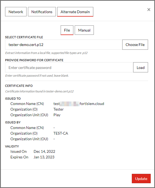 The certificate provided must be an SSL/TLS X.509 version 3 certificate. It must contain a public key, the fully qualified domain name (FQDN) for your alternate domain, and information about the issuer.