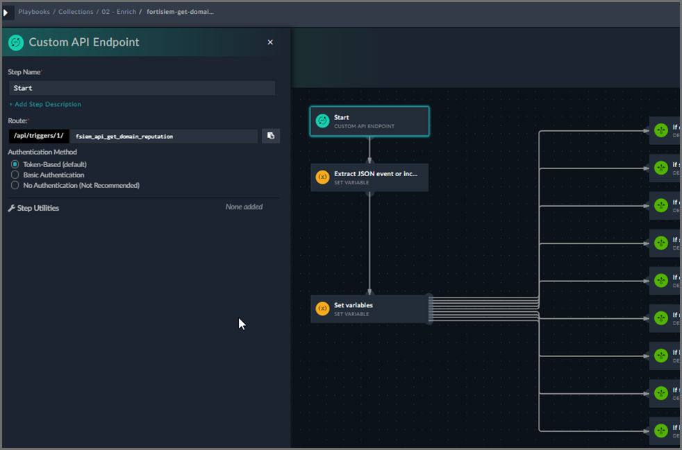 FortiSIEM compatible Playbooks all start with a Step type called “Custom API Endpoint”. FortiSOAR then creates a URI for that specific Playbook that can be called.