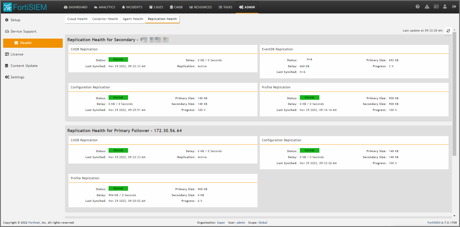 - Check Cluster health to make sure that Leader and Follower health are good and replication is up to date.