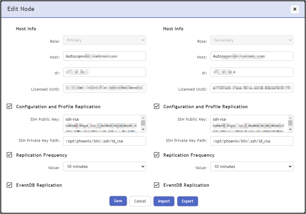 /opt/phoenix/bin/.ssh/id_rsa - For Replication Frequency, select a value indicating how frequently Profile database and SVN-lite files will be rsynced by the Follower node. The default 10 minutes is adequate for most operations.