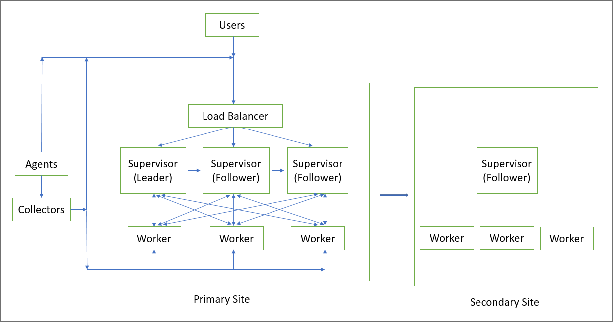 You can setup multiple Supervisors in Active-Active mode with an external Load Balancer in front. This enables you to log in to any Supervisor node and perform any GUI operation. Supervisor node functionalities are distributed across the available Supervisor nodes. An Active-Active Supervisor Cluster provides resilience against Supervisor failures, allows higher number of GUI users, Agents, Collectors, and higher volume of rule and query processing.