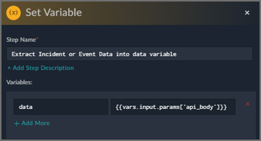 For example, in a FortiSOAR Playbook, the Set Variable Action can use the {{…}} expression to assign the FortiSIEM JSON data into a list variable called data.