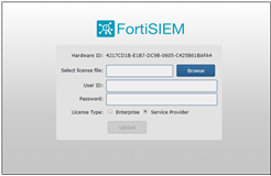 - Once FortiSIEM is installed, log in and click Browse to select the license file.