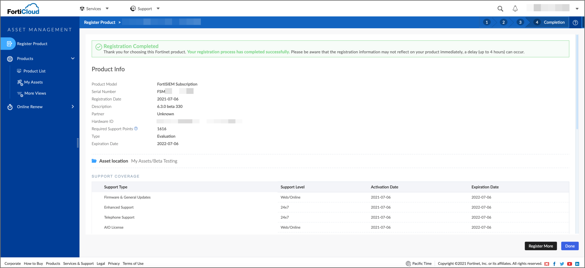 - On FortiCare, click Register Product and add the Registration code of the new device.