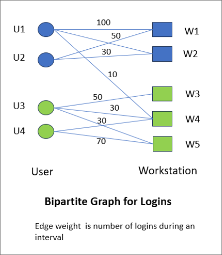 As an example, consider the following login scenario between users U1, U2, U3, U4 and Workstations W1, W2, W3, W4. The login is modeled as a weighted Bipartite graph as shown below.