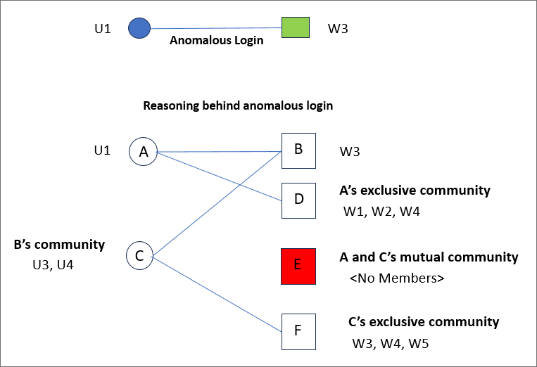 A login from user U1 to Workstation W3 is considered an anomaly because user U1 and W3’s user community (namely U3 and U4) do not access common workstations.