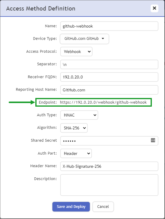 In the Reporting Host Name field, enter "GitHub.com". This field expects the source hostname of the sending application. It is used to uniquely identify the logs as it will be in the header of every log. You can use something like example.com if example.com was the vendor's domain.