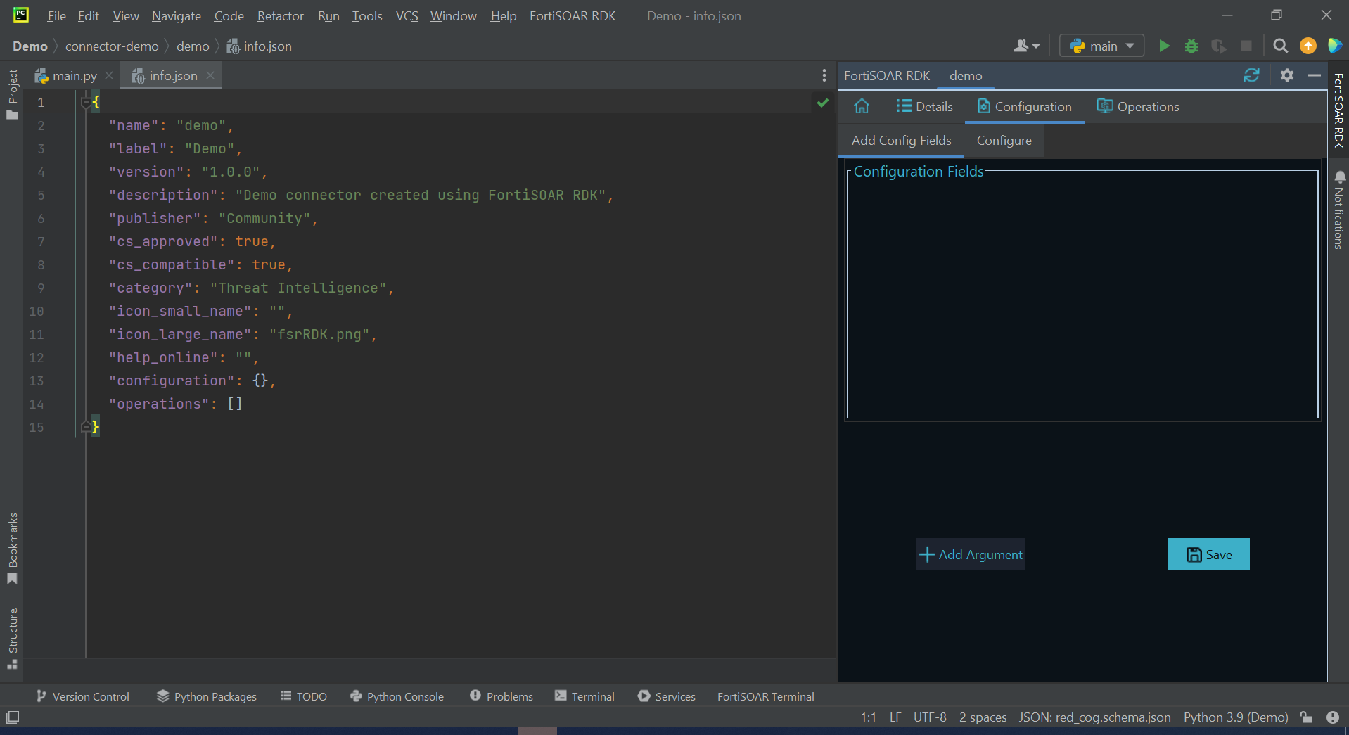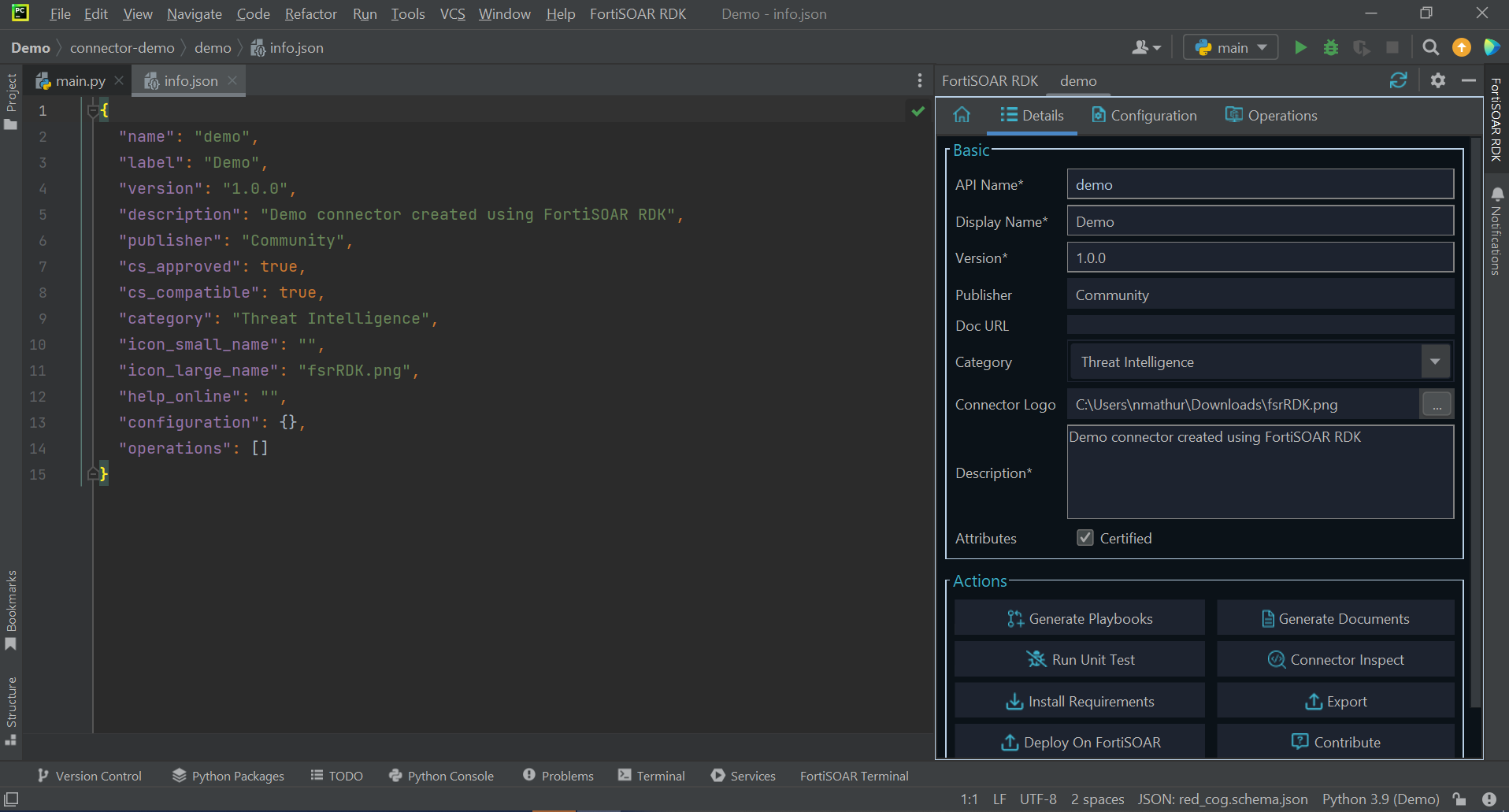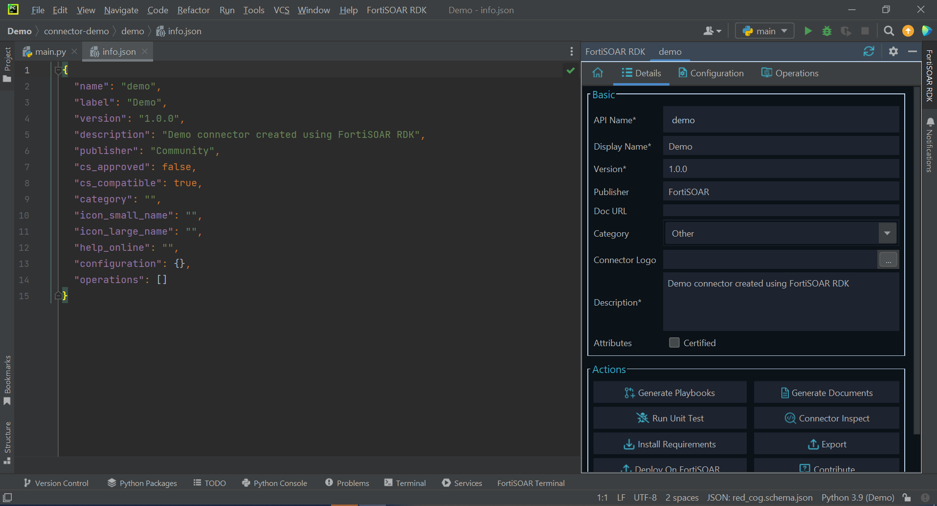 Once you complete entering the required values in the 'New FortiSOAR Connector' dialog, click OK. Clicking OK displays, a success message and opens the info.json file of the connector. This also opens the Details tab in FortiSOAR RDK with the API Name you have specified, 'demo' in our example: