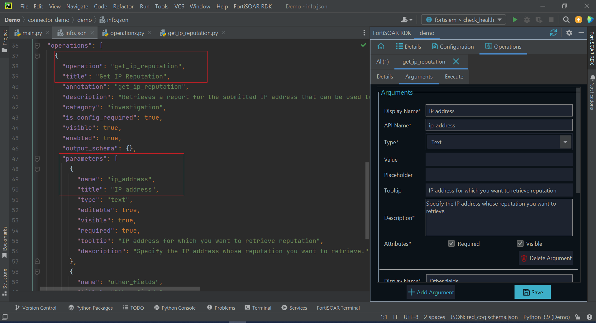 To add another input parameter, click Add Argument and follow the same procedure. Once you have added all the required parameters for the input parameter field for the operation, click Save to save the input parameters. This adds the parameters and their details within the "operation":{ section of the info.json file: in the "parameters":{ section. For example, the "IP address" parameter in the "Get IP Reputation" operation: :