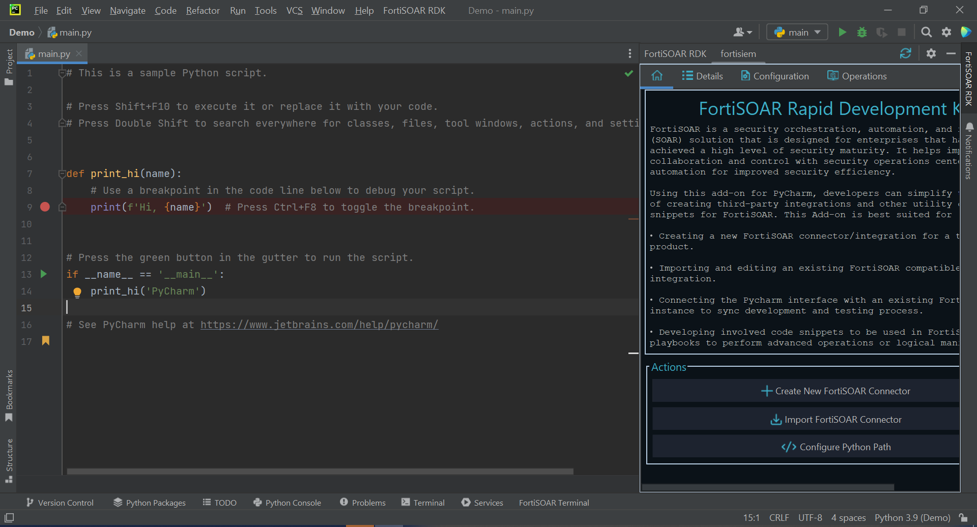 Use the FortiSOAR Rapid Development Kit (RDK) to efficiently create third-party integrations (connectors) and other utility code snippets for FortiSOAR. This add-on simplifies the process of creating the following:
