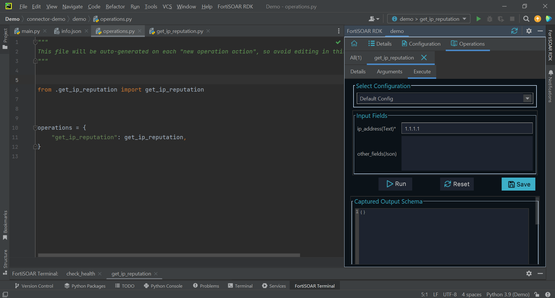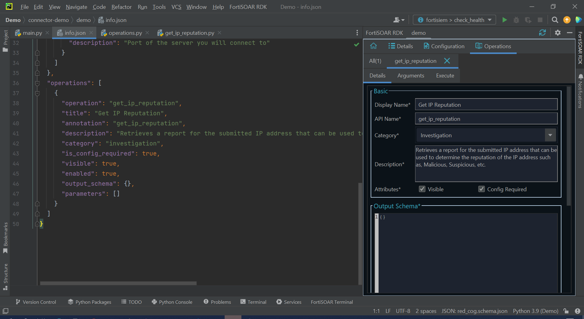 Once you have entered all the required parameters for the operation, click Create. This creates a new .py file with the operation name, for example, get_ip_reputation.py, and also adds the operation details in the "operations":{ section of the info.json file: