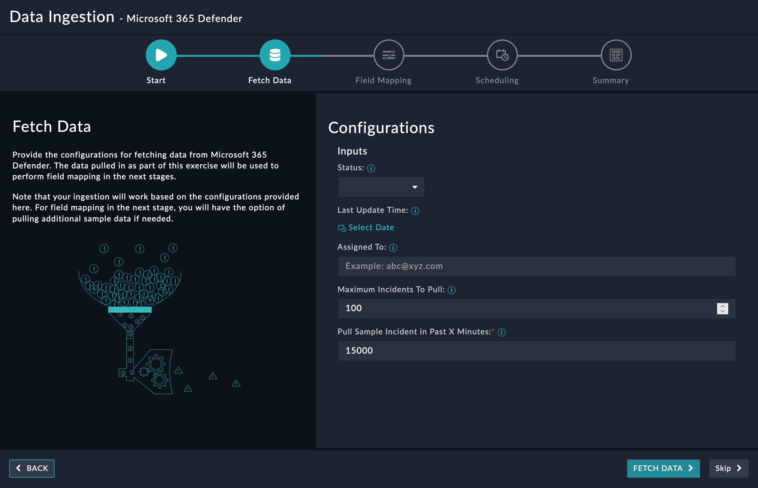 x minutes, status, last updated time, and assigned To fields to filter incidents pulled from Microsoft 365 Defender. The fetched data is used to create a mapping between the Microsoft 365 Defender data and FortiSOAR™ incidents.