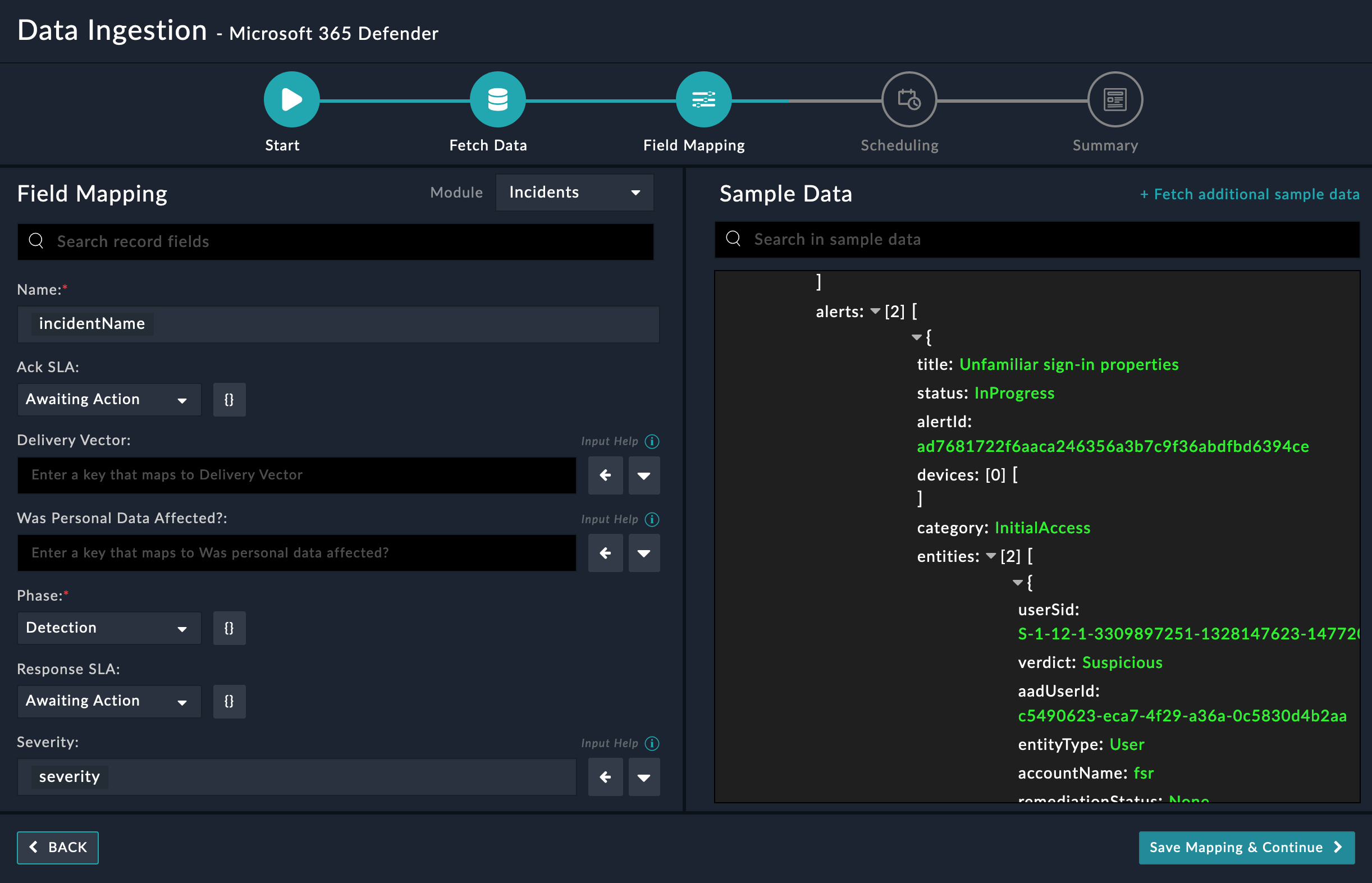 The Data Ingestion Wizard enables you to configure scheduled pulling of data from Microsoft 365 Defender into FortiSOAR™. It also lets you pull some sample data from Microsoft 365 Defender using which you can define the mapping of data between Microsoft 365 Defender and FortiSOAR™. The mapping of common fields is generally already done by the Data Ingestion Wizard; users mostly require to only map any custom fields that are added to the Microsoft 365 Defender incident.
