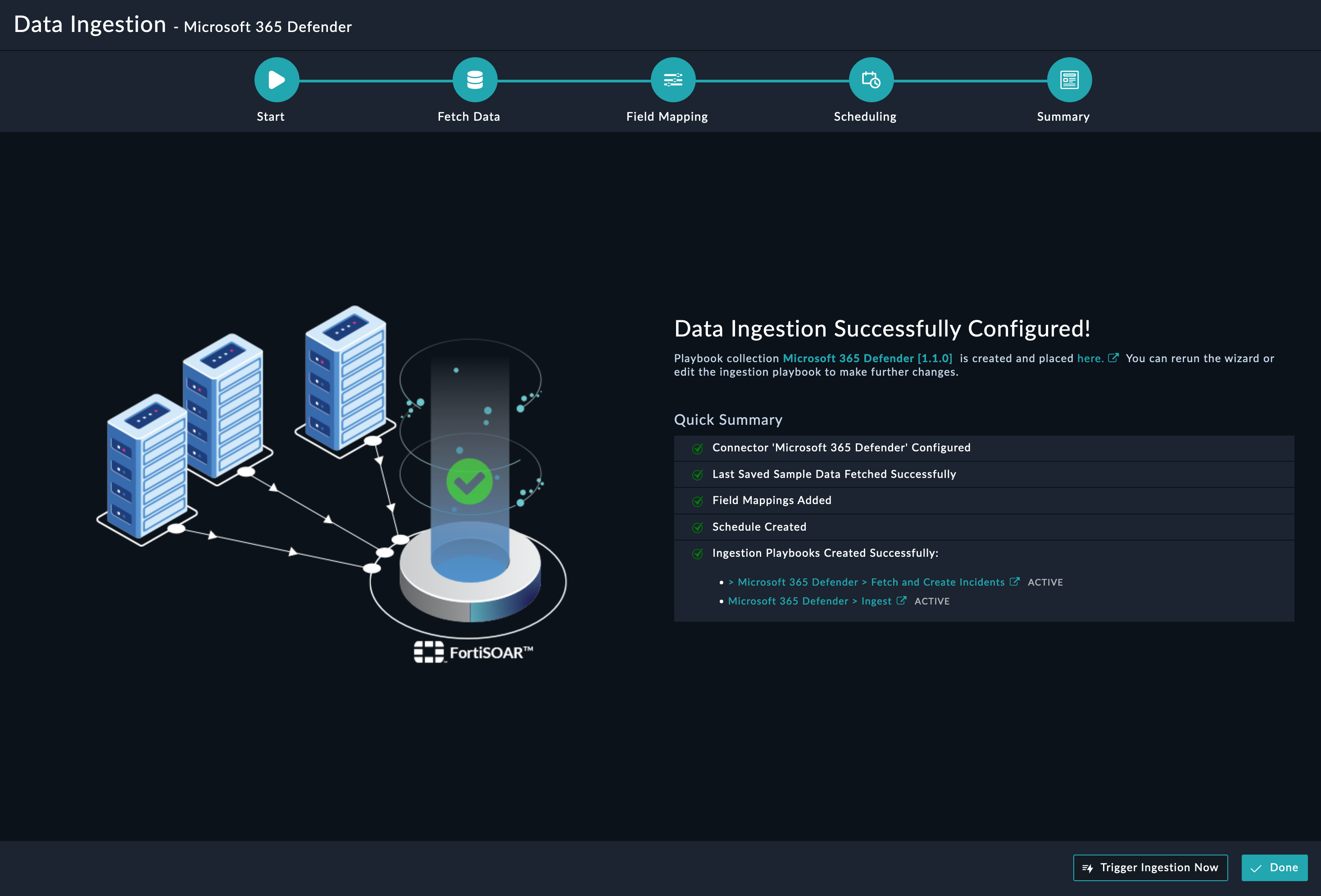 The Summary screen displays a summary of the mapping done, and it also contains links to the Ingestion playbooks. Click Done to complete the data ingestion and exit the Data Ingestion Wizard.