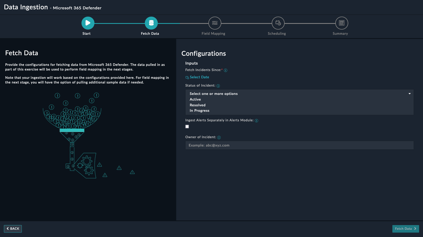 On the Fetch Data screen, provide the configurations required to fetch Microsoft 365 Defender data.