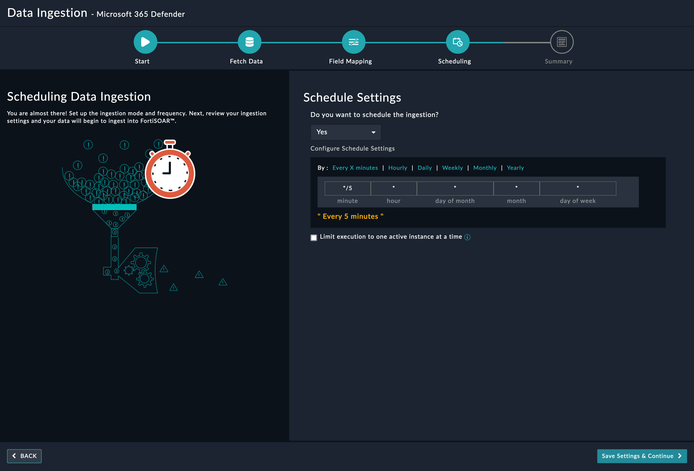 (Optional) Use the Scheduling screen to configure schedule-based ingestion, i.e., specify the polling frequency to Microsoft 365 Defender, so that the content gets pulled from the Microsoft 365 Defender integration into FortiSOAR™.