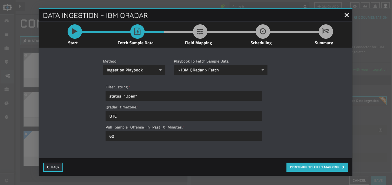 Connectors page, you will see the list of installed connectors, either in the card view or the grid/list view.Connector Configuration pane, click Configure Data Ingestion to display the Data Ingestion Wizard.Welcome screen and if all the requirements to ingest data are met, click the Continue button to display the Fetch Sample Data screen. > IBM QRadar > Fetch playbook.status="Open" in the Filter_string field.UTC.