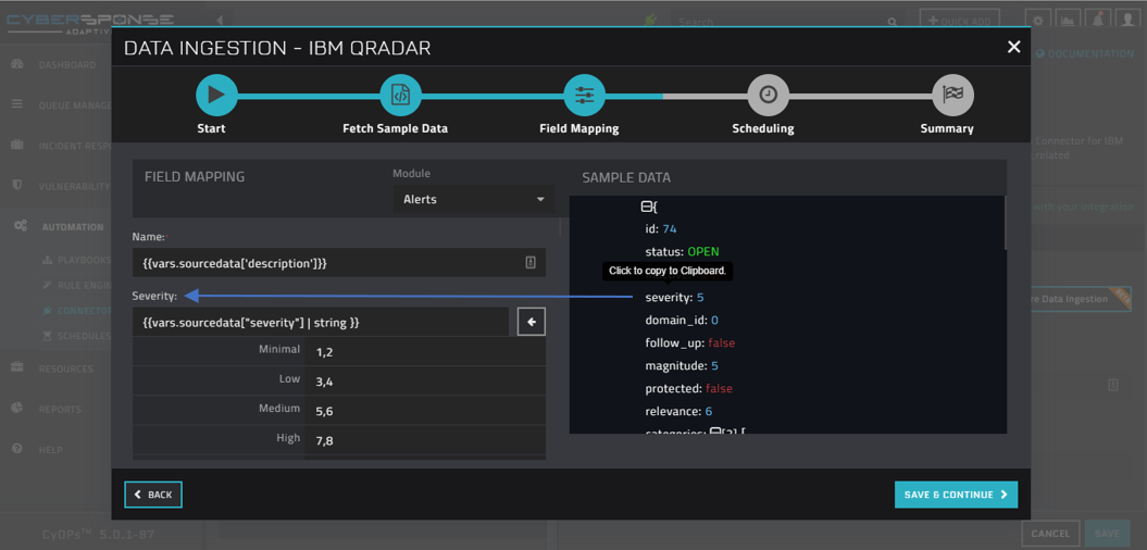 You can similarly map the other picklists such as Status and Type.{{vars.offense_data | toJSON }} by default, contains the object of the entire offense.Scheduling screen, you can specify the schedule for data ingestion from the connector into FortiSOAR™, i.e., you can specify the polling frequency to IBM QRadar, so that the content gets pulled from IBM QRadar into FortiSOAR™. Summary screen displays a brief summary of the mapping done and it also contains links to the modified playbooks.