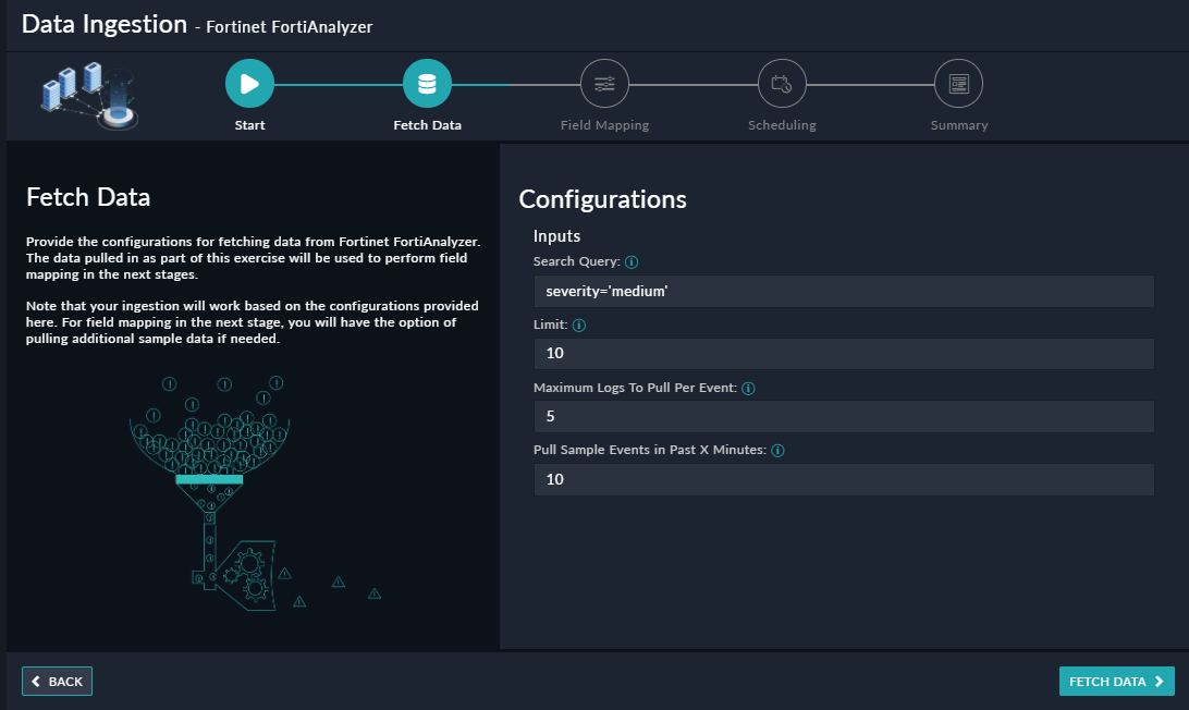 The Data Ingestion Wizard enables you to configure scheduled pulling of data from FAZ into FortiSOAR™. It also lets you pull some sample data from FAZ using which you can define the mapping of data between FAZ and FortiSOAR™. The mapping of common fields is generally already done by the Data Ingestion Wizard; users mostly require to only map any custom fields that are added to the FAZ event.