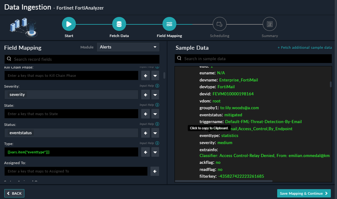 For more information on field mapping, see the Data Ingestion chapter in the "Connectors Guide" in the FortiSOAR™ product documentation. Once you have completed mapping fields, click Save Mapping & Continue.