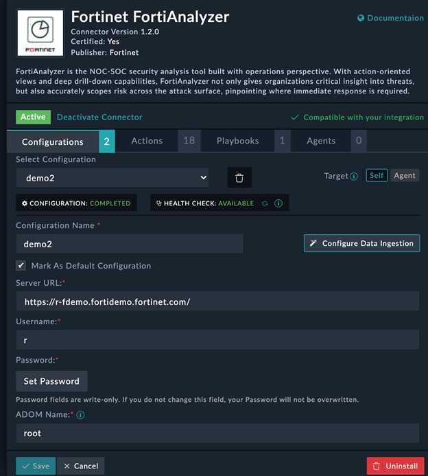 In FortiSOAR™, on the Connectors page, click the Fortinet FortiAnalyzer connector row (if you are in the Grid view on the Connectors page), and in the Configurations tab enter the required configuration details: