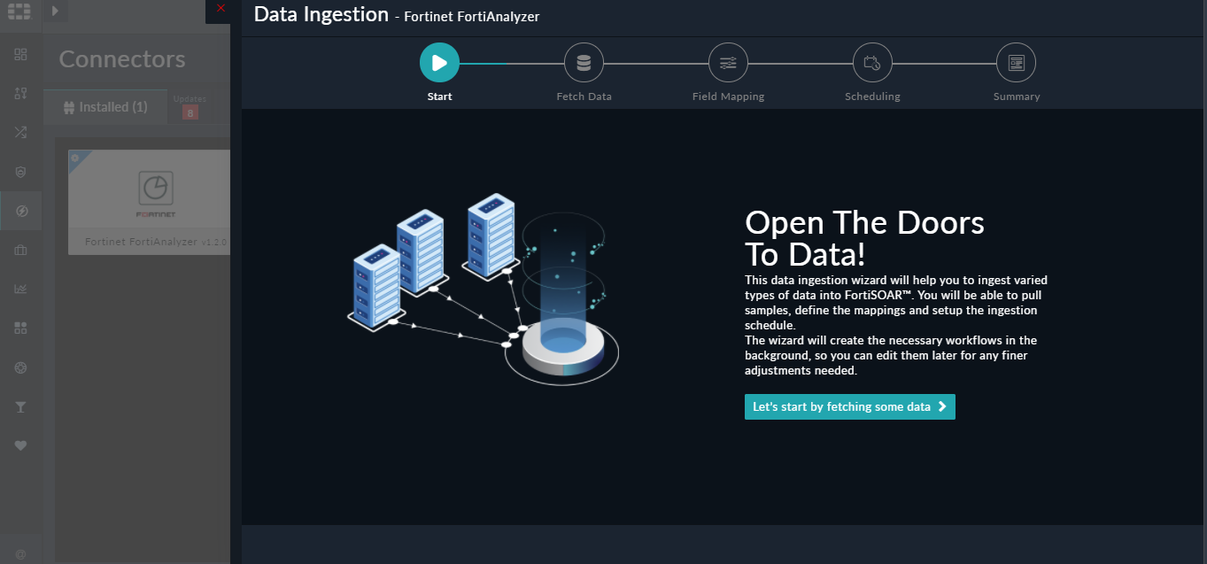 Use the Data Ingestion Wizard to easily ingest data into FortiSOAR™ by pulling incidents from Fortinet FortiAnalyzer. Currently, "events" in Fortinet FortiAnalyzer are mapped to "alerts" in FortiSOAR™. For more information, see the Data Ingestion Support section