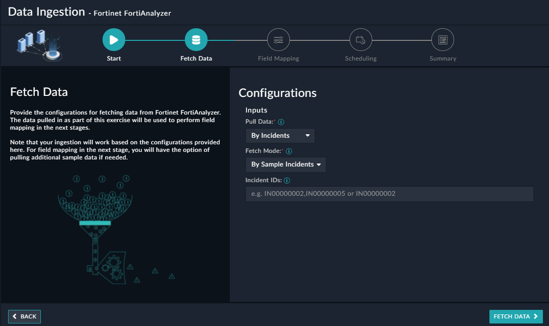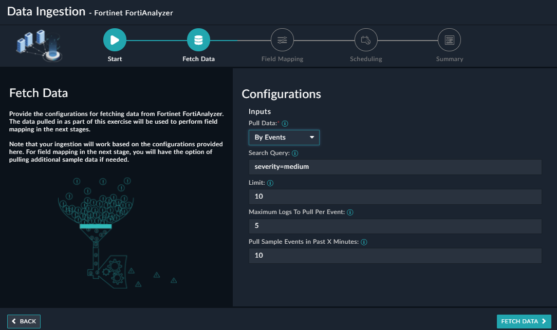 From version 1.5.0 of the Fortinet FortiAnalyzer dual data ingestion is supported, i.e., you can choose either 'Incidents' or 'Events' to pull data from Fortianalyzer. Therefore, from version 1.5.0 onwards, each connector configuration can pull either incidents or events depending on your selection on the Fetch Data screen of the Data Ingestion Wizard.