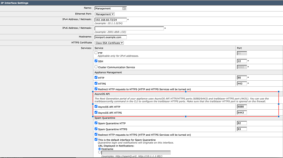 | Port | AsyncOS API port of the Cisco ESA server. Defaults to 6443 for the https protocol. For the http protocol port should be set as 6080. |