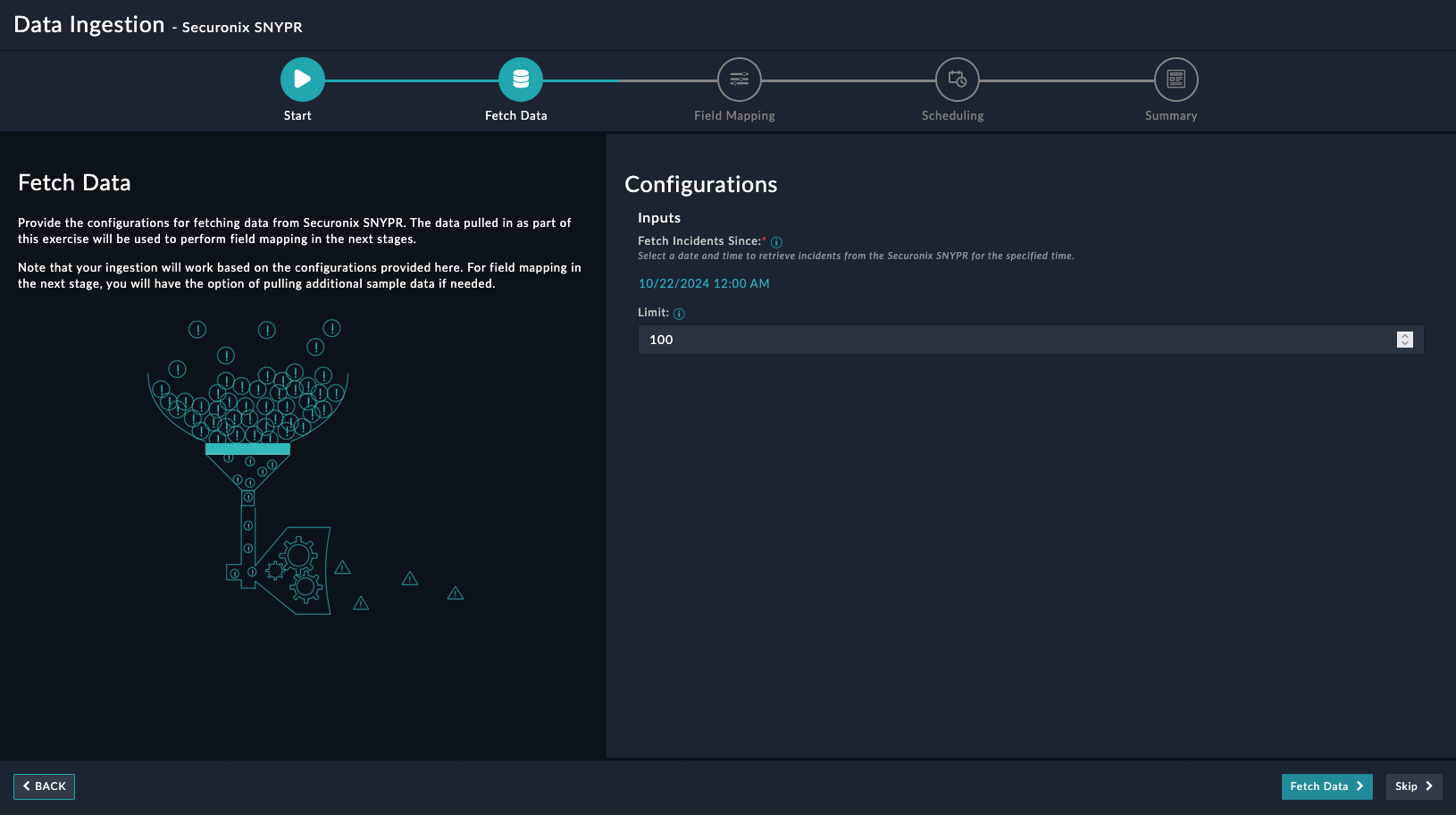 On the Fetch Data screen, provide the configurations required to fetch incidents from Securonix SNYPR.