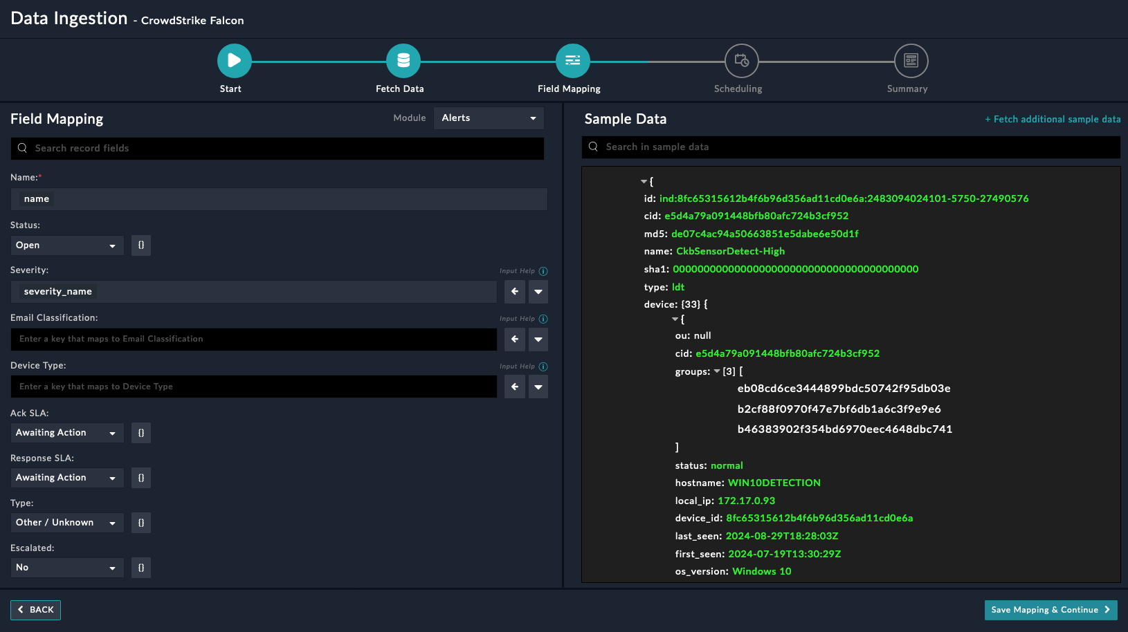 For more information on field mapping, see the Data Ingestionchapter in the Connectors Guide in the FortiSOAR™ product documentation. Once you have completed the mapping of fields, click Save Mapping & Continue.