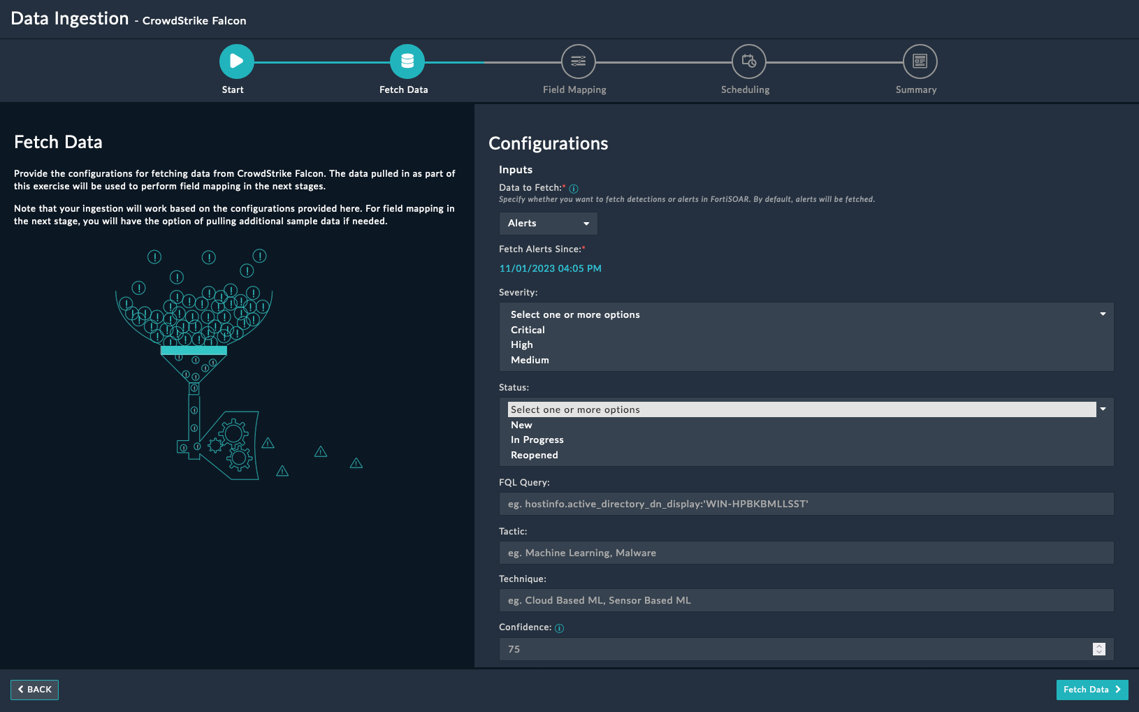 On the Fetch Data screen, provide the configurations required to fetch CrowdStrike Falcon data.